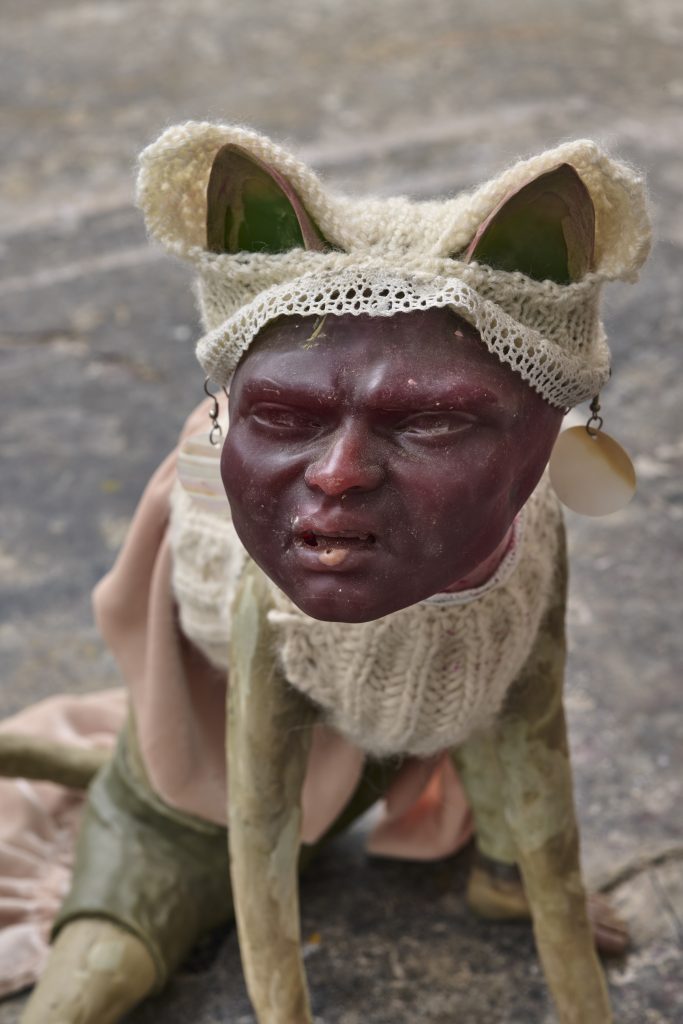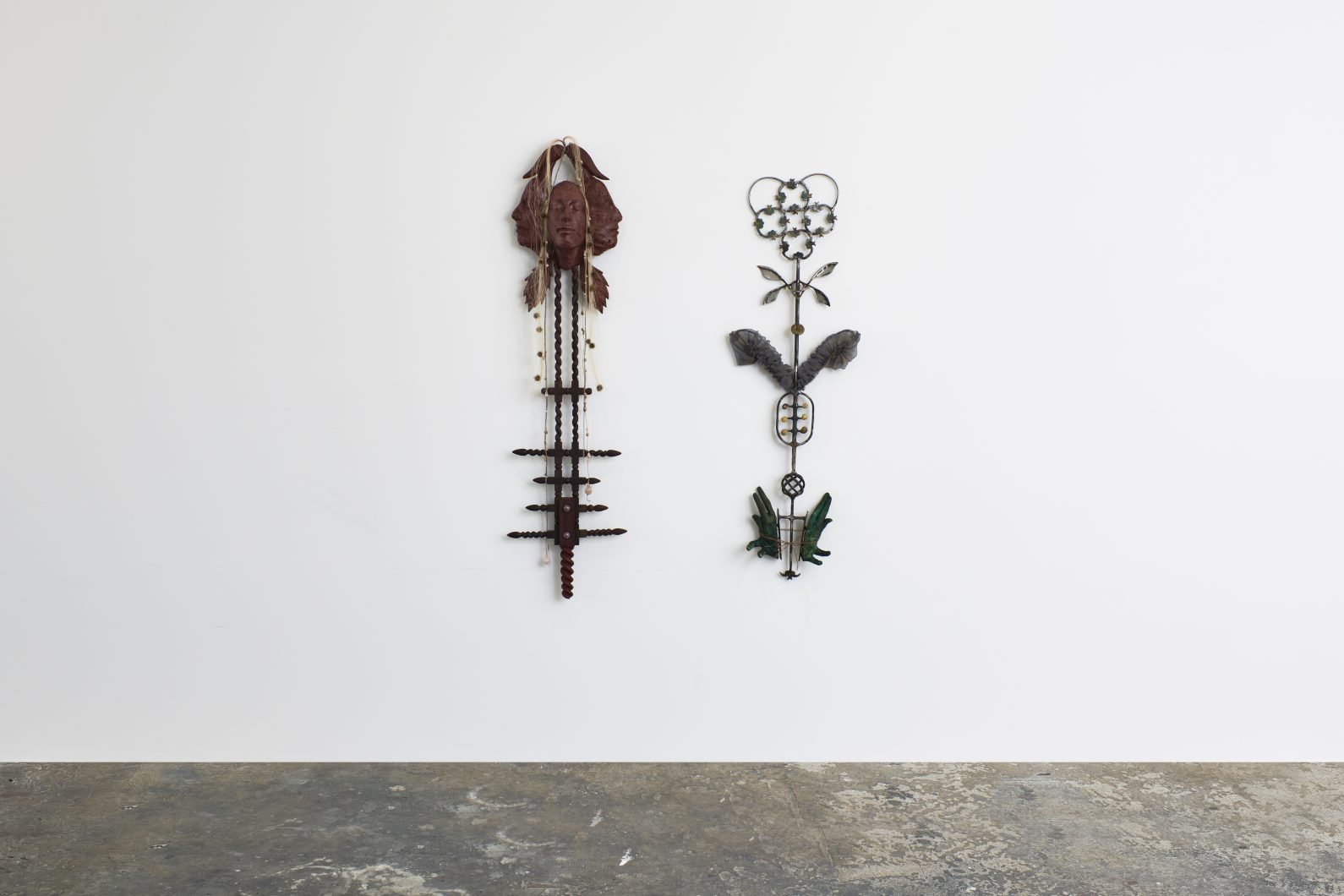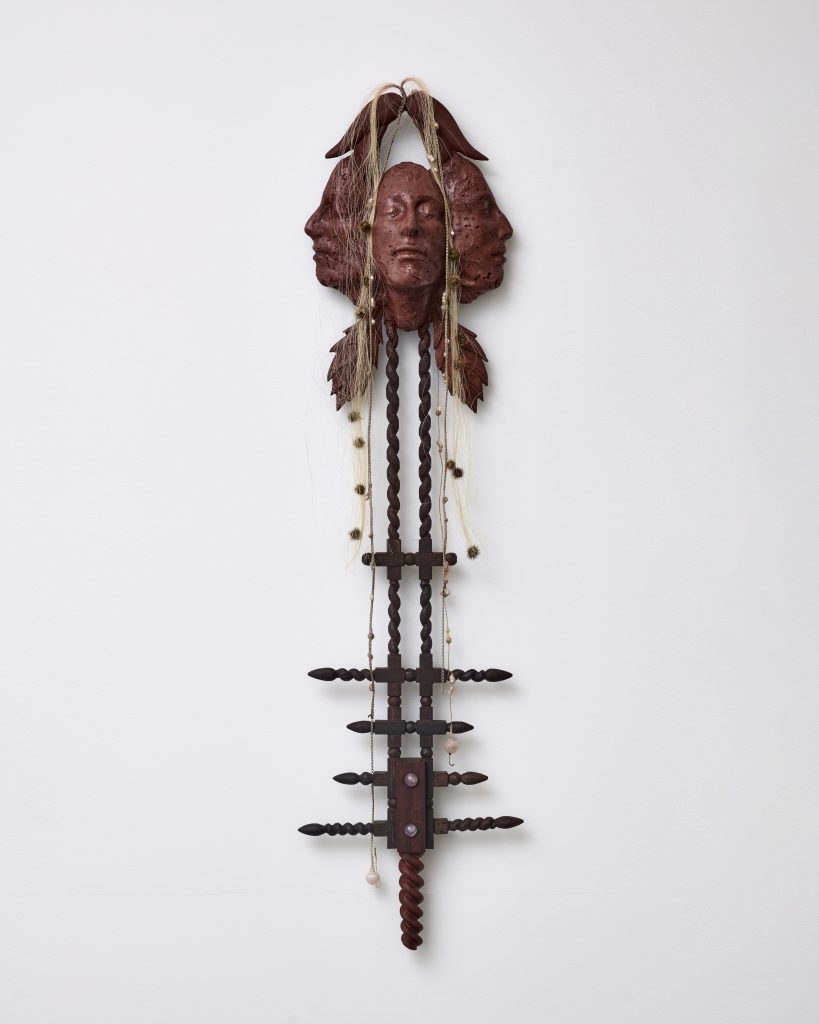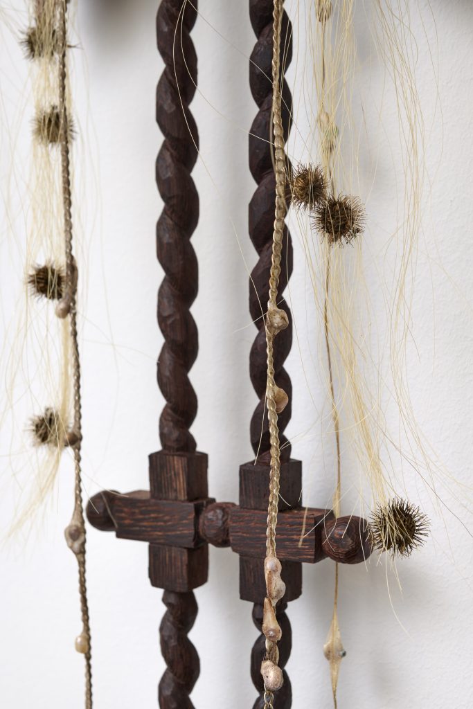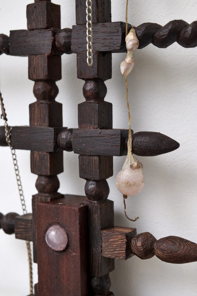 Carved wood (wengé meranti), resinated papier mâché coated in tinted wax, pink quartz crystals, river pearls, goat trips, burdock fruits, chains, horse hair, mixed crystal beads