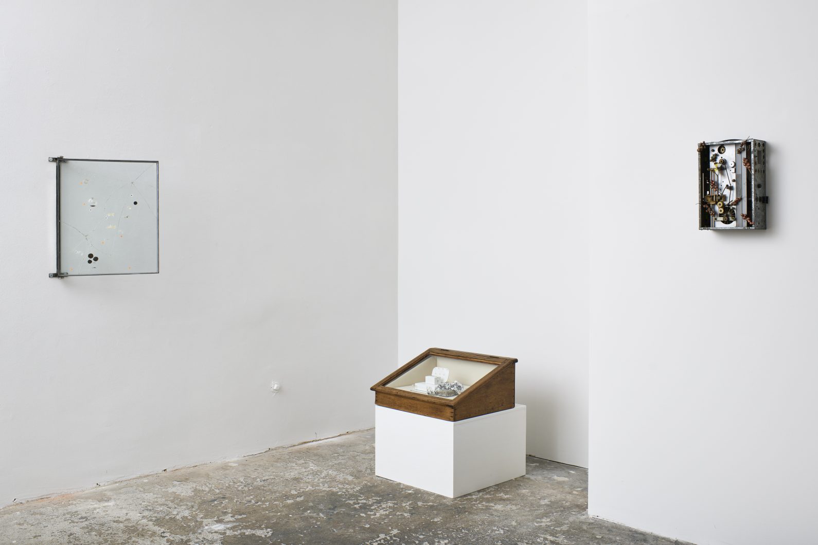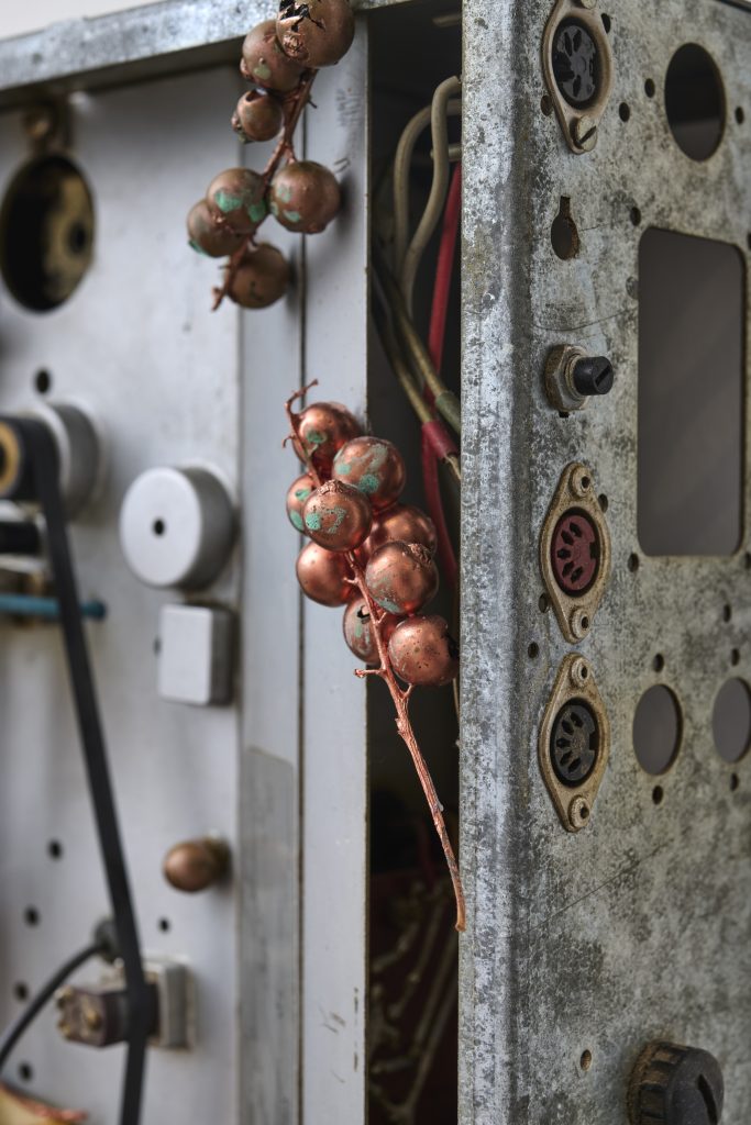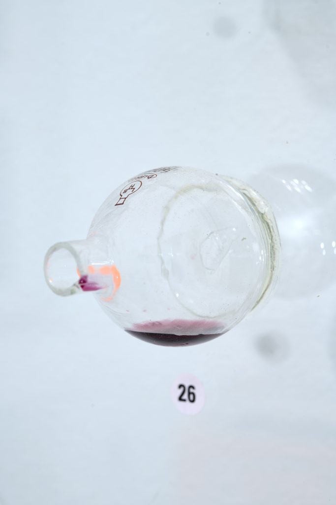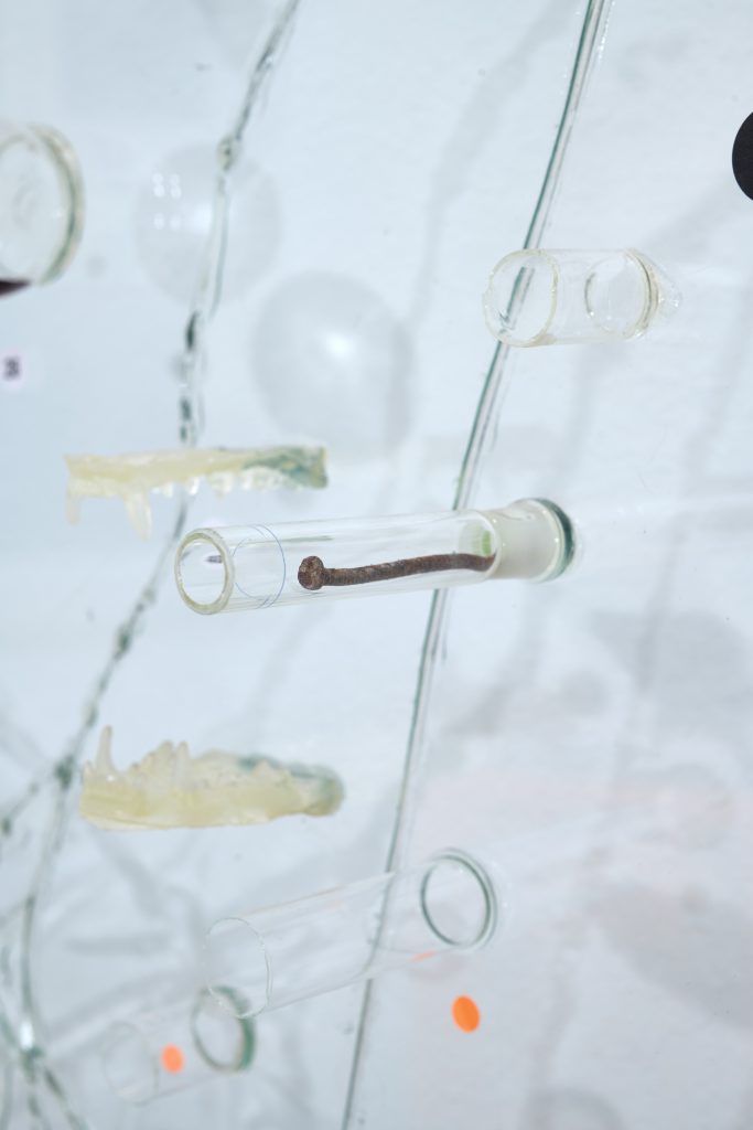 Glass, metal, test tubes, rusty nail, resin-cast badger teeth, stickers, dried american lotus, red wine
