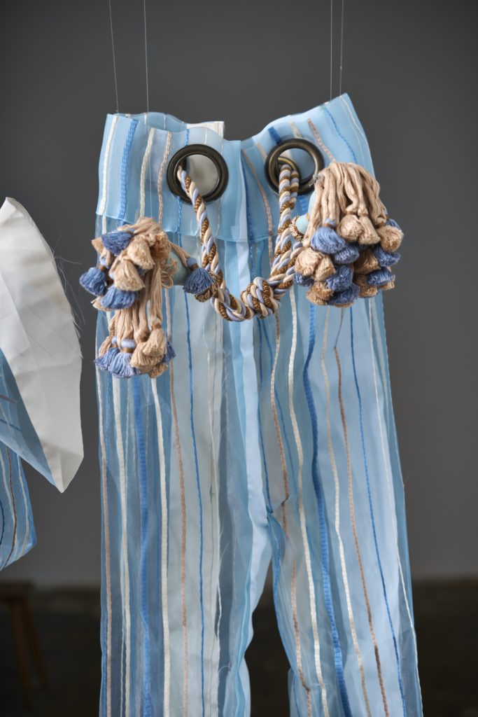 Curtain, tieback, found document holder, pencil on paper