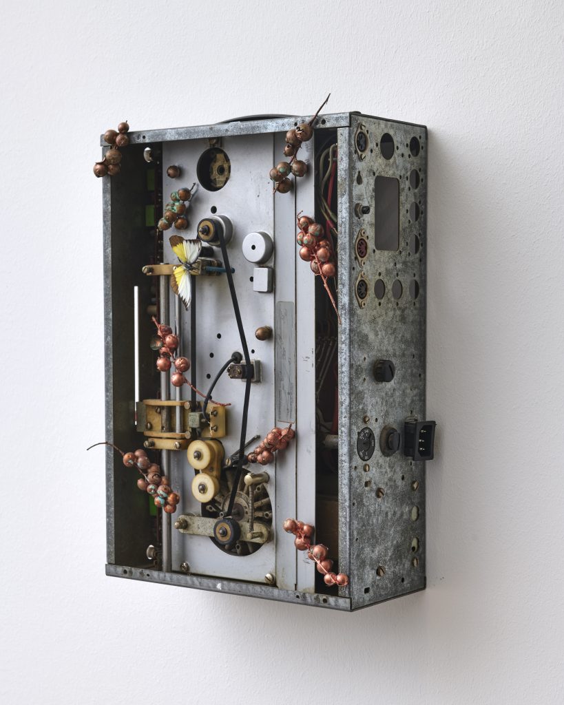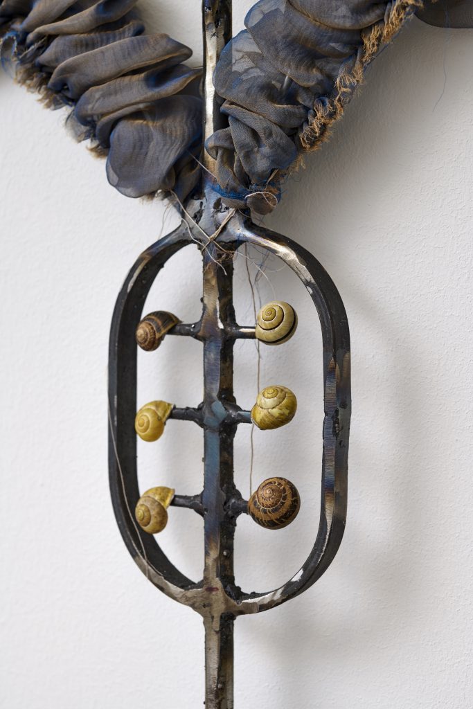Recycled steel (oiled), snail shells, resin, silk mousseline, crystal, copper wires, painted (oil) jesmonite