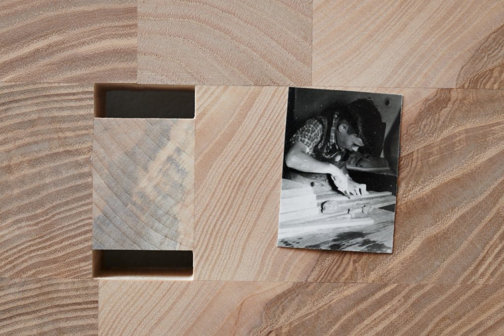 Ash, walnut, olive, stump maple, MDF, varnish, gouache, photo print